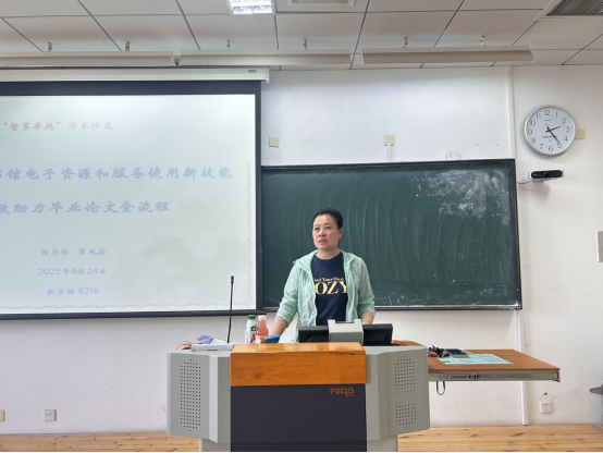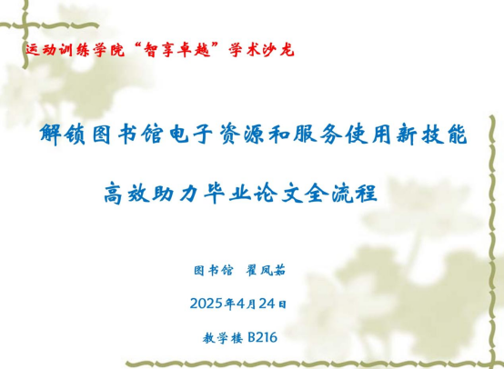 2025年4月24日下午,beat365官方网站于教学楼B216成功举办了一场主题为“解锁图书馆电子资源和服务使用新技能高效助力毕业论文全流程”的学术沙龙活动。本次活动特邀天津体育学院图书馆信息部翟凤茹老师为同学们进行学术分享。